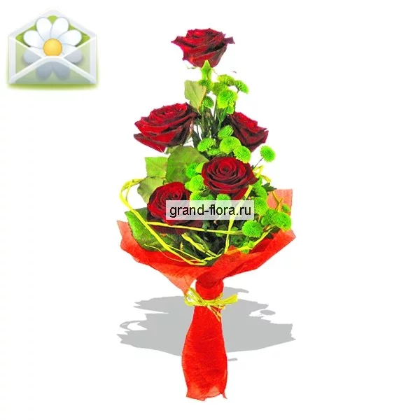 Яркие красные розы, в сочетании с зеленью хризантемы - трудно назвать поиском гармонии, так как композиция просто дышит органичностью и совершенством. Цвета выгодно дополняют друг друга, а нежный аромат создает настроение праздника и волшебства. Но, может быть, для полного совершенства не хватает парочки штрихов? Выберете букетную карточку или открытку, чтобы высказать свой восторг и искренние чувства! Ваша любимая возьмет этот букет в руки - гармония будет найдена.