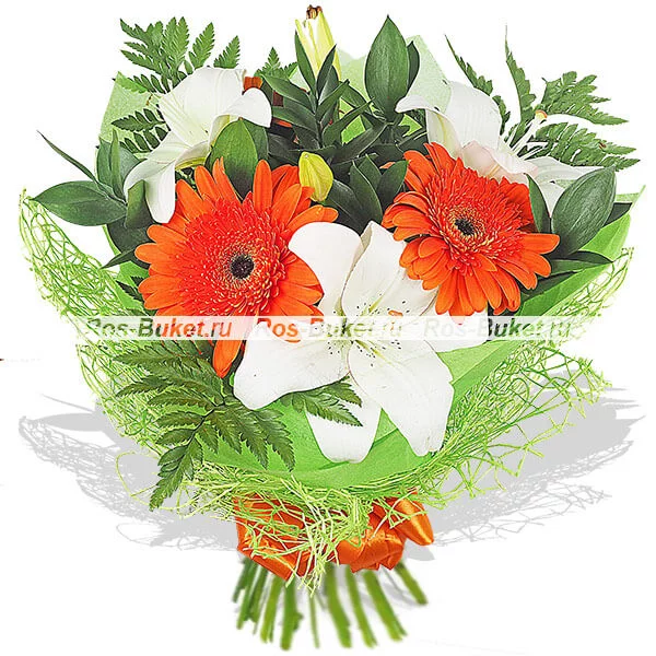 ДЕЛЮКС: лилия белая - 2 шт, гербера оранжевая - 7 шт, рускус, папоротник - 5 шт, фетр розовый.