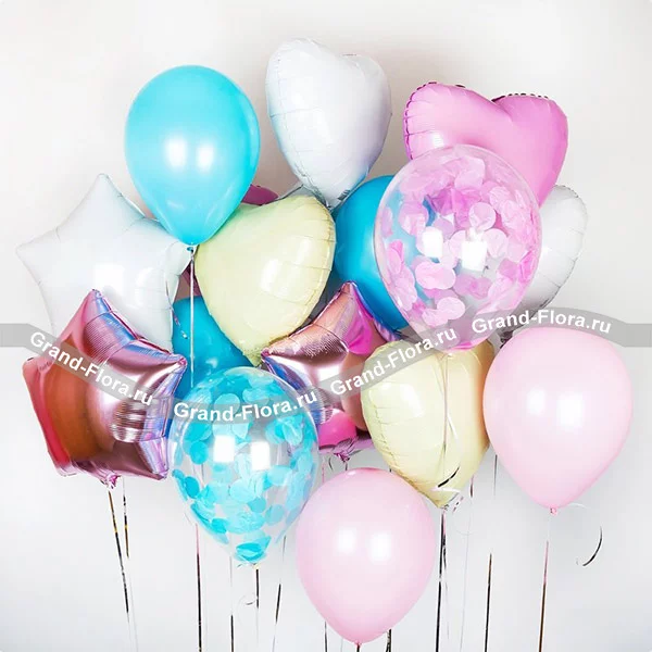 Стандартный: фольгированная звезда - 3шт., фольгированное сердце - 5шт., латексный шар - 6шт, латексный шар с конфетти - 2шт.