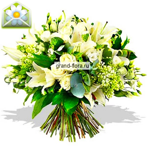 Очень нежная и интеллигентная композиция для утонченной барышни с изысканными манерами. Букет состоит из прекрасных благородных цветов, таких как лилии, розы и сирень. В таком оригинальном сочетании каждый цветок словно оживает и превращается в «ангела». Композиция украшена потрясающим декором в виде листьев эвкалипта, что предает букету строгости и некой экстравагантности. Композиция словно опьяняет сладким ароматом любовных грез.